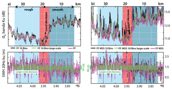As in Figure 6, but top of (a,b) shows along-track NRCSs (i.e., σ0) measured by the SRAL altimeter (in synergy with the OLCI) with the SAR-mode retracking color-coded in (a) UFSAR, UFSAR 10 Bins and its large-scale mean and in (b) UFSAR MSS, UFSAR MSS 10 Bins and its large-scale mean (using a box running average of 3 km). Bottom plots show SWHs’ large-scale variations of 0.39 m in (a) and 0.53 m in (b), identified in the green shaded rectangles, when comparing the section in front of the primary ISW with that in the rear for the same products.