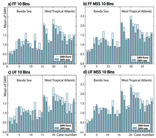 Bar plots representing significant wave heights (SWHs) for leading (front) and trailing (rear) sections of the ISWs for all cases in Table S1 using different algorithms: (a) FF 10 Bins. (b) FF MSS 10 Bins. (c) UF 10 Bins. (d) UF MSS 10 Bins.
