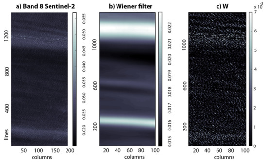 Firstly, we verify the azimuthal angles that were found to be between 30° and 70°, in this specific case at around 35°. Band 10 is used to detect and discard high cirrus clouds, meaning that cirrus clouds are filtered with a threshold of 0.003. In this case, all pixels satisfy this criterion, and the image section is hence unaffected by high cirrus clouds. Then, we apply a wiener filter (see Figure 10), with a window size of 60 pixels (see Section 2.4 and [42]). This is a low-pass filter that is usually applied to an intensity image that has been degraded by constant power additive noise. The wave breaking fraction (W) is the difference between original Band 8 (NIR) and this filtered image (see Figure 10).