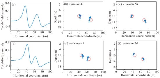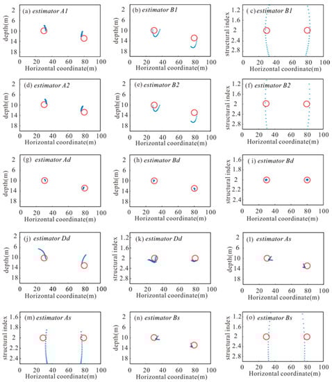Figure 1c,d are the source locations calculated using estimators A1 and B1. The true locations of the cylinders are labeled by red circles, and the estimated results are labeled by blue crosses, each representing a different location derived from a different data window. The depths are shallower than the actual values and showed some scattered points. Figure 1e,f show estimated depths using estimators Ad and Bd without screening. They show accurate but scattered source locations, which are less conducive to interpretation.