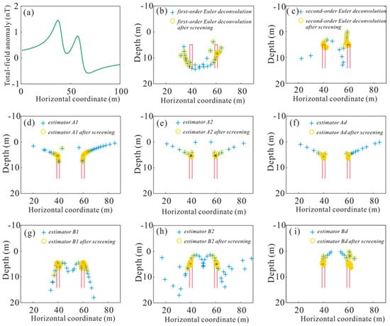(a) Total magnetic anomaly of two infinite vertical sheets having a magnetic inclination of 60° and a declination perpendicular to strike; (b) source location results generated by first-order Euler deconvolution; (c) source location results generated by second-order Euler deconvolution; (d) source location results generated by estimator A1; (e) source location results generated by estimator A2; (f) source location results generated by estimator Ad; (g) source location results generated by estimator B1; (h) source location results generated by estimator B2; (i) source location results generated by estimator Bd.