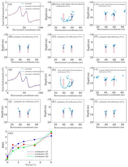 (a) Total magnetic anomaly of two infinite vertical sheets having a magnetic inclination of 60° and a declination perpendicular to strike, a noise-corrupted magnetic anomaly with a Gaussian noise of 1% and a noise-corrupted magnetic anomaly with a subsequent Gaussian filter; (b) source location results generated by first-order Euler deconvolution method after filtering; (c) source location results generated by second-order Euler deconvolution method after filtering; (d) source location results generated by estimator A1 after filtering; (e) source location results generated by estimator A2 after filtering; (f) source location results generated by estimator Ad after filtering; (g) total magnetic anomaly of two infinite vertical sheets having a magnetic inclination of 60° and a declination perpendicular to strike, noise-corrupted magnetic anomaly with a Gaussian noise of 3% and noise-corrupted magnetic anomaly with a subsequent Gaussian filter; (h) source location results generated by Euler deconvolution method after filtering; (i) source location results generated by Euler deconvolution method after filtering; (j) source location results generated by estimator A1 after filtering; (k) source location results generated by estimator A2 after filtering; (l) source location results generated by estimator Ad after filtering; (m) RMS between the true depths and average of all the depths computed by estimators A1, A2 and Ad with decreasing noise.