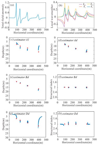 (a) Magnetic anomaly of four cylinders having a magnetization inclined at 60°; (b) first- and second-order local wavenumbers of magnetic anomaly in Figure 5a; (c) source location results generated by estimator A1; (d) source location results generated by estimator Ad; (e) source location results generated by estimator Bd; (f) structural index results generated by estimator Bd; (g) source location results generated by estimator Dd; (h) structural index results generated by estimator Dd.