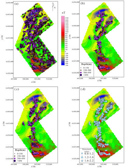 We applied different combinations of local wavenumbers to interpret the magnetic data observed in the Qian’an region to locate iron ore deposits. Figure 9a shows the locations of the source estimated by estimator C1. Figure 9b,c show the superimposed results computed by estimators Cd and Bd, respectively, and the results showed less scattering. The depth of the source was concentrated between 150 and 450 m. Figure 9d shows the structural index estimated by estimator Bd. The value at the peaks is close to 1, which is marked by a triangle, indicating that the source was almost a sphere. This might reflect the fact that the flight lines were far apart, so the 2D features that were oblique to the flight lines, and should have formed linear anomalies on the grid, formed a number of discrete anomalies, such as on our map. We have modified the geological map based on the inversion results and revised the locations of the magnetic formations (dark red) in Figure 10. The modified magnetic formations range is similar to geological inference and more detailed in local areas. There were four large magnetic features that were interpreted as iron ore deposits.