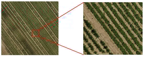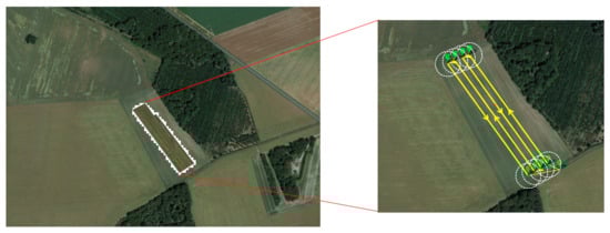 The drone followed a specific flight plan and the camera captured RGB images at regular intervals as shown in Figure 2 and Figure 3. The images captured have respectively a minimum longitudinal and lateral overlapping of 70% and 50–60% depending on the fields vegetation coverage and homogeneity, assuring a better and complete coverage of the whole field of 4 ha (40,000 m) and improving the accuracy of the orthorectified image of the field.