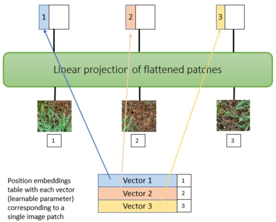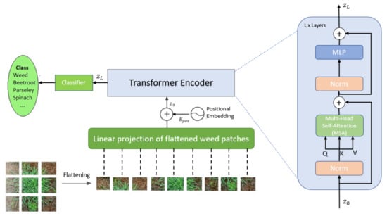 Figure 7 presents the architecture of the vision transformer used in this paper for weed and crop classification. It is based on the first developed ViT model by Dosovitskiy et al. []. The model architecture consists of 7 main steps. Firstly, the input image is split into smaller fixed-size patches. Then each patch is flattened into a 1-D vector. The input sequence consists of the flattened vector (2D to 1D) of pixel values from a patch of size 16 × 16.
