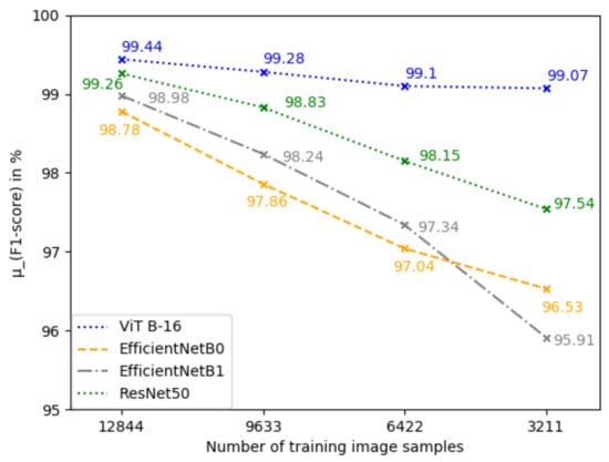 Furthermore, we compared the performance of the models with by varying the number of testing images while using a 5-folds leaving one fold out cross-validation technique. The ViT results for each class are reported in Table 4. It can be observed that there is a slight decrease in performance along the reduction of the train set and the increase of the test set, indicating a good stability of ViT with the variation of the dataset size. As shown in Figure 13, there is a notable decrease in the F1-Scores of the four models while testing on 9632 and 12,843 images and training with only 33.3% and 16.7% of the labelled dataset. On the third experiment, models were trained on only 3211 images and also validating on 3211 images, which explains the decrease in their performances. Even though all models have a decrease in their F1-Scores with an increasing number of testing images, the ViT B-16 model still achieves higher performance than EfficientNet B0, EfficientNet B1 and ResNet50. The ViT B-16 model had the smallest decrease in performance from 99.44% (from 3210 testing images and 12,844 training images) to 98.63% (from 12,844 testing images an 3211 training images).