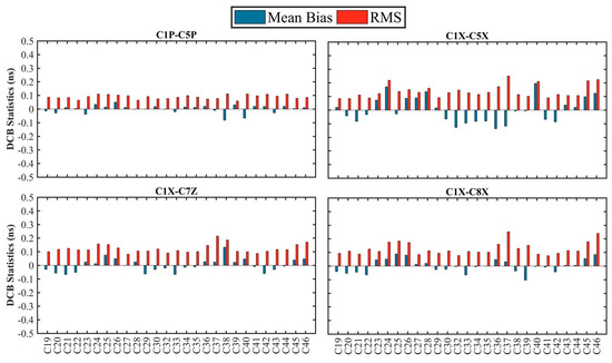 The mean bias and RMS of our estimated C1P-C5P, C1X-C5X, C1X-C7Z, and C1X-C8X, of BDS-3 satellite DCBs, with respect to the direct values provided by CAS products.