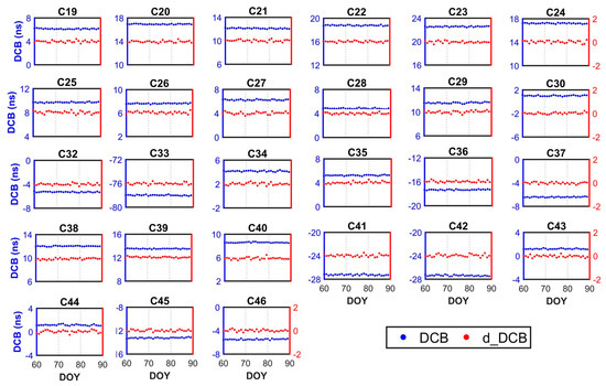 The Global Navigation Satellite System (GNSS) has been widely used in geosciences and life [1,2]. In particular, China’s BeiDou Global Navigation Satellite System (BDS-3) was officially operated for global users on July 31, 2020 [3]. As the first hybrid constellation of navigation satellite systems in the world, BDS-3 has been developing rapidly and providing global services, and can provide positioning, navigation, and timing (PNT) services [4]. BDS-3 transmits other new signals of multiple frequency bands, which is compatible with signals of B1 and B3 provided by the BeiDou regional navigation satellite system (BDS-2). Multi-frequency signals provide plentiful observations for satellite applications but also introduce new errors in the positioning process [5,6]. For example, the difference of hardware delay between the signals of double-frequency bands is designated as the differential code bias (DCB), which affects the accuracies of the ionospheric modeling and GNSS precise positioning [7,8]. There are multiple channels for BDS observations on the same frequency, which are summarized in Table 1 from the Receiver Independent Exchange (RINEX) format (https://files.igs.org/pub/data/format/rinex305.pdf). Therefore, the multiple DCBs caused by multi-channel signals of BDS-3 should be estimated and analyzed accurately.