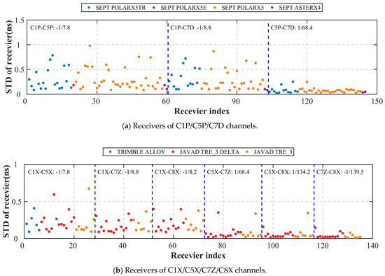 Distribution of STDs for all BDS-3 receiver DCB types of C1P/C5P/C7D channels (a) and C1X/C5X/C7Z/C8X channels (b) during the period of DOY 60–89 in 2021. Receiver index is arranged according to the classification and order in Table 4. The digitals represent coefficients of the ionospheric correction with corresponding DCB types.
