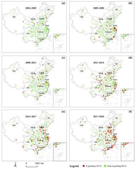 Spatiotemporal changes in expanding NCTs in China: (a) 2002–2005, (b) 2005–2008, (c) 2008–2011, (d) 2011–2014, (e) 2014–2017, (f) 2017–2020. Period from 2000 to 2002 was not mapped because there were no expanding NCTs.