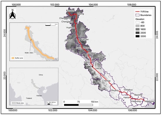 This paper selects the railway landscape of the YVR as its research object. The study focuses on both the Chinese section (Kunming—Hekou) and the Vietnamese part (Laocai—Haiphong), with a total length of 855 km. An international perspective dealing with both these two sections has never been discussed in the previous research. The railway route in this area passes various landscape types: urban space, countryside, forest, mountainous area, and different cultural landscape such as the French-style stations, stone or metallic bridges, and so on, which provides landscape enjoyment along the trip. Not only should the heritage sites along the railway be protected, but also those landscapes of outstanding beauty. The related administrative bodies include 13 counties in Yunnan and nine counties in North Vietnam, covering an area of nearly 51,000 km2, from 102°43′12″E—106°42′54″E to 20°51′53″N—25°03′35″N (Figure 1).