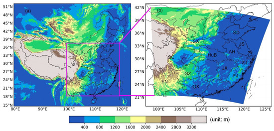 The WRF model domain (a) and the study region range (b); the colors represent the height of the terrain. The abbreviations for Shandong, Shaanxi, Anhui, Sichuan, Hubei, Guizhou, Jiangxi, Fujian, Yunnan, Guangxi, Zhejiang and Jiangsu are SD, SX, AH, SC, HuB, GZ, JX, FJ, YN, GX, ZJ and JS, respectively.