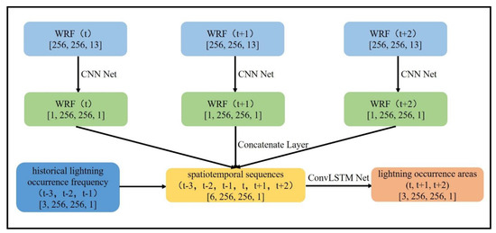 The WRF model products are hourly weather conditions, including 13 variables, such as maximum reflectivity (Rmax) and CAPE. Since the number of variables of the lightning occurrence frequency and the WRF model products are different and cannot be merged to form a spatiotemporal sequence in the time dimension, a two-dimensional convolutional network called CNN Net is first used to convolve the WRF model products to perform feature extraction and compress the number of variables to 1. Since the CNN Net performs feature extraction for WRF model products separately, the model products do not contain a temporal dimension, and the north–south and east–west dimension is also 256 × 256, so the dimensions of WRF model products are [256, 256, 13], namely [rows, columns, variables]. The convolved results are merged with the lightning occurrence frequency in the time dimension, which contains the starting forecast moment from 3 h in the past to 3 h in the future, forming a spatiotemporal sequence of dimensions [6, 256, 256, 1]. Subsequently, ConvLSTM Net is used to extract features in time and space and then perform spatiotemporal sequence prediction to achieve hourly lightning occurrence area nowcasting for the next 0 to 3 h. The network structure and data flow are detailed in Figure 2.
