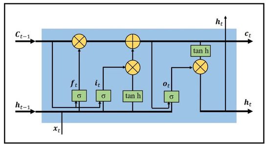Shi et al. (2015) proposed ConvLSTM networks based on fully connected LSTM networks (FC-LSTM) [31]. FC-LSTM is good at processing data that are strongly correlated in anterior and posterior sequences and is often used for time series prediction. In addition to the temporal continuity of radar and precipitation data, they also have strong spatial characteristics in space, which can lead to the loss of spatial information when processed with FC-LSTM. The convolution operation is used in ConvLSTM to extract features instead of the fully connected method in FC-LSTM, which can capture sufficient spatial information, and the structure diagram is shown in Figure 4. Furthermore, , and represent input gate, forgetting gate and output gate, respectively; , and represent input variable, hidden variable and storage unit, respectively; t represents the step of the network; σ is the sigmoid function with the output range of [0, 1]; tan h represents the hyperbolic tangent function with the output range of [−1, 1]; W and b are the weights to be trained and bias, respectively.