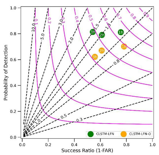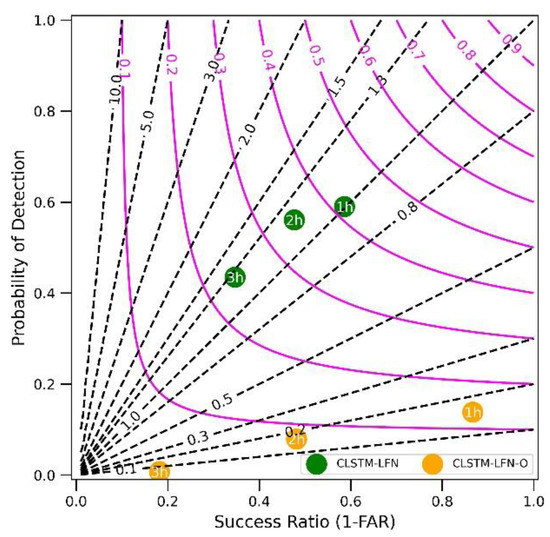 Further performance diagrams were used to quantitatively evaluate the forecast results (Figure 6), and TS, POD, FAR and bias scores are included in the diagram [56]. The TS scores of CLSTM-LFN are higher than those of CLSTM-LFN-O at different forecast times. The POD scores for the CLSTM-LFN hourly forecast results are 0.81, 0.79 and 0.81, and the POD scores for the CLSTM-LFN-O hourly forecast results are 0.70, 0.67 and 0.62. CLSTM-LFN forecasts a larger range of lightning occurrences and a higher FAR, so the bias values are all greater than 1.
