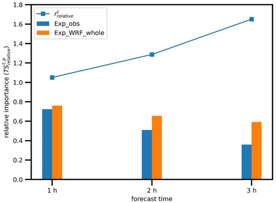 The results of Exp_obs and Exp_WRF_whole showed that the relative importance of both variables decreased with increasing forecast time in the 0 to 3 h period (color bar in Figure 10). The calculation results of increase with increasing forecast time, indicating that the importance of numerical model products increases gradually compared with historical lightning occurrence frequency (blue line in Figure 10). The reason is that, as the forecast time increases, the lightning location and intensity keep changing, which leads to a decrease in the valid information provided by historical observations and an increase in the meteorological conditions represented by the numerical model.