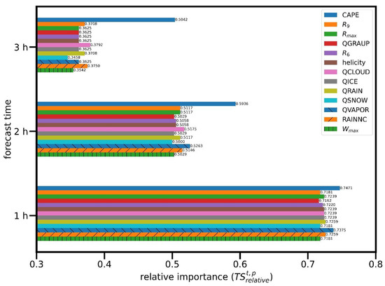The results of Exp_WRF_sequence showed that the importance of each variable decreases with increasing forecast time (Figure 11). The relative importance of CAPE remains above 0.5 and is significantly greater than that of other physical variables, while the relative importance of microphysical variables, such as QGRAUP and Rmax, decreases more rapidly with increasing forecast time. Generally, a larger CAPE tends to produce stronger convective activities [59], and several studies have shown that there is a strong correlation between CAPE values and thunderstorms [60,61], which provides an indication for the occurrence of lightning in atmospheric circulation. With increasing forecast time, the deviation of microphysical variables forecasted by numerical model products gradually increases, causing its relative importance to decrease rapidly. However, the type, content and spatial distribution of ice-phase particles have a certain correlation with the location of lightning [62,63,64], which still provides a reference for the occurrence of lightning at the microscopic level and is an indispensable variable in the process of the nowcasting model.