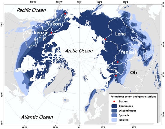 Figure 1. Locations of the five large pan-Arctic river basins: Lena, Yenisei, Ob, Mackenzie, and Yukon (https://worldmap.harvard.edu/data/geonode:wribasin_1eu, accessed on 1 March 2021); distribution of permafrost (https://nsidc.org/data/GGD318/versions/2, accessed on 13 April 2021) [20]; and locations of gauge stations.