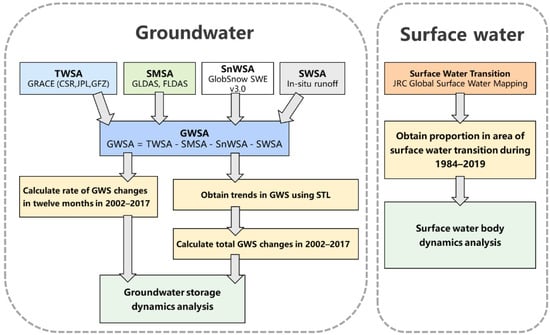 In this study, the total water storage anomaly (TWSA) from GRACE, soil moisture (SM) from the Global Land Data Assimilation System (GLDAS) and Famine Early Warning Systems Network Land Data Assimilation System (FLDAS), snow water equivalent (SWE) from spaceborne radiometers and in situ runoff were used to evaluate GWS changes in 2002–2017. Joint Research Centre (JRC) Global Surface Water data were also used to evaluate the surface water transition by calculating the proportion in each area of the transition types over the period 1984–2019.