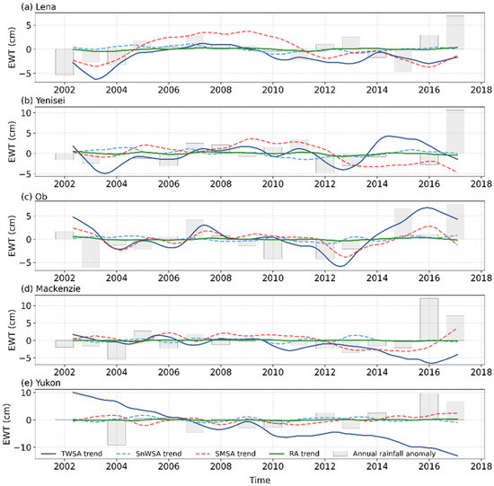 Figure 3. Trends in TWSA (deep blue line), SMSA (red dashed line), SnWSA (light blue dashed line), RA (green line), and annual rainfall anomaly (gray bar) from April 2002 to January 2017 in Lena, Yenisei, Ob, Mackenzie, and Yukon. EWT refers to equivalent water thickness.