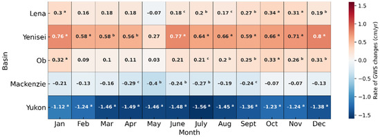 Figure 4. Trends in GWSA (cm/year) in different months over 2002–2017. The horizontal axis refers to months and vertical axis refers to the five basins. The value in each square of a panel refers to the rate of GWS change in a specific month over the 15-year period. The p-values were calculated using the Wald Test with a t-distribution of the test statistic. “a” refers to a p-value ≤ 0.01, “b” refers to 0.01 < p-value ≤ 0.05, and “c” refers to 0.05 < p-value ≤ 0.10.