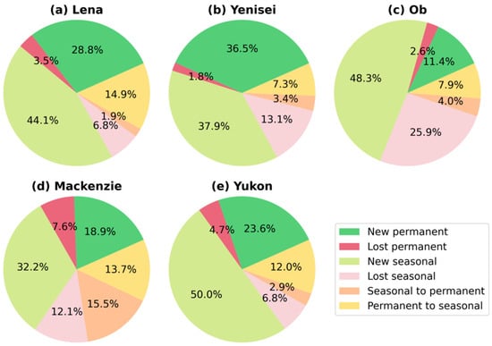 We categorized permanent, seasonal, ephemeral permanent, and ephemeral seasonal SW into unchanged SW types and categorized new permanent, new seasonal, lost permanent, lost seasonal, permanent to seasonal, and seasonal to permanent SW into changed SW types. Then, we calculated the area proportions of the six changed SW categories in each basin (Figure 6). New permanent and new seasonal SW were the primary contributors to SW dynamics in the past 35 years (1984–2019), accounting for more than 50% in each basin. There was an interesting pattern in Ob (Figure 6c): Much of the seasonal SW was lost (48.3%), while considerable new seasonal SW occurred (25.9%) during 1984–2019. In Mackenzie, lost permanent SW was one of the primary SW transition types compared with the other basins, with a proportion of 7.6%. Moreover, the transition between permanent and seasonal SW was also significant in Mackenzie, where the proportions of seasonal to permanent SW and permanent to seasonal SW were 15.1 and 13.7%, respectively.
