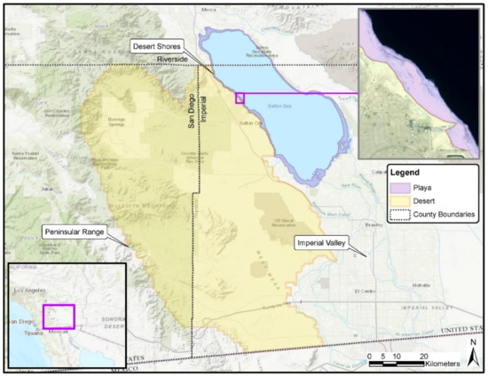 In our recent studies, a series of field campaigns were conducted with the goal to better understand dust emissions potential at the exposed playa and desert region to the west of the Salton Sea, a terminal lake located in southern California [56,57]. Dust emission potential represents the dust emission flux of a surface when subjected to a wind-driven friction velocity or sheer stress [58]. Crust type, the presence of surface sand, and soil moisture were identified as the most influential characteristics on erodibility of the playa surface [56,57]. The desert region near the Salton Sea is a complex assemblage of geomorphic surfaces. Partitioning the area into landform-based classes helps to evaluate the extent that each surface type and condition contributes to the overall dust emissions in the study area. This paper describes the utilization of remote sensing techniques to map important surface characteristics in support of dust emissions estimates. This study was conducted in support of the Salton Sea Air Quality Mitigation Program (SSAQMP) as part of a broader effort to quantify emissions from exposed playa and desert areas in the Salton Trough [56,57].