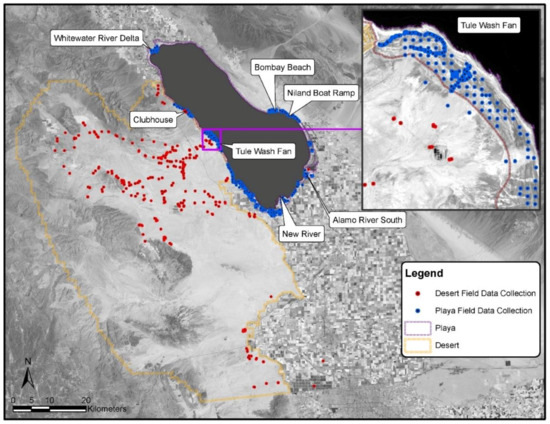 The desert study domain is not as dynamic or varying compared to the playa domain. It also covers a much greater spatial extent. Therefore, additional ground-truth points collected over 14 field campaigns on 39 days between June 2014 and April 2020 were utilized for the geomorphic mapping of the desert domain. Furthermore, additional points were selected by photo-interpretation informed by these ground-truth data and by random selection of points from maps previously developed by the California Geological Survey [63] in the area. Locations of the data collected are shown in Figure 2.