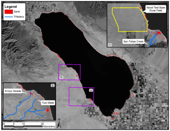 The migration of sand onto playa surfaces from external sources primarily occurs on the west side of the playa study domain. Aeolian deposition driven by strong westerly winds and fluvial deposits delivered by extensive, sand-laden, ephemeral creeks are the key mechanisms contributing to surficial sand deposits on the playa. A notable example of aeolian transport is the encroachment of the Salton Sea Dunes onto exposed playa surfaces at the Naval Test Base (Figure 5). Despite having a diminution in sand supply, the extensively characterized dune field has the capacity to deliver large amounts of sand onto playa surfaces [85,86,87,88]. The three primary tributaries on the west side of the Salton Sea include Arroyo Salada, Tule Wash, and San Felipe Creek (Figure 5). These tributaries deposit sediment across two alluvial fans, where sand is then available for aeolian redistribution. The larger of the two fans is located south of Salton City and is a composite of Arroyo Salada and Tule Wash (Figure 5). The San Felipe Fan is the smaller of the two fans, located approximately 15 km south (Figure 5). Sand deposited by these tributaries is distributed as diffuse sand drifts and linear strips of coppice dunes. Sand deposited onto playa surfaces is often reworked by longshore currents, swash zones, or aeolian activity. The quantity and extent of loose surficial sand deposits fluctuate as new deposition occurs, deposits are modified, or sand is sequestered via integration with developing salt crusts. Our results are generally consistent with the knowledge of sand deposition and movement in the region.