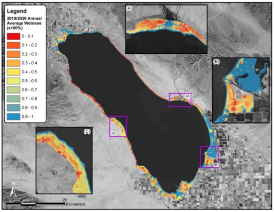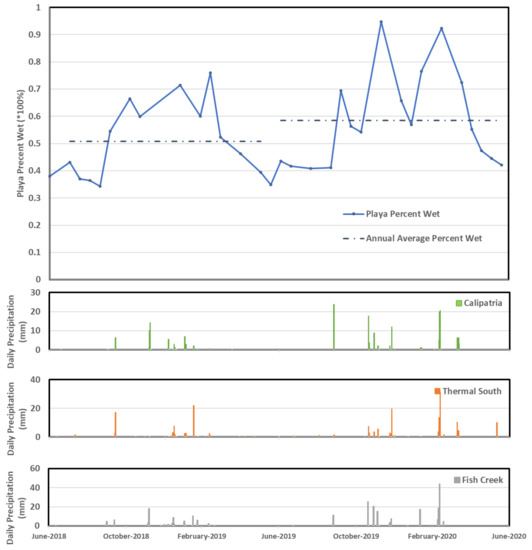 An empirical model was applied on the Landsat 8 data SWIR 1 band to derive a surface soil moisture map within the playa domain as two classes: “dry” and “wet.” This threshold was selected to provide a more conservative view of wetness in the original design. This was later validated by a field campaign conducted on 15 April 2020. A total of 85 locations on the playa were visited, and soil moisture conditions were assessed. Among the 85 locations, 22 locations were identified as “dry,” while 63 locations were identified as “wet.” A corresponding Landsat 8 image from 16 April 2020 was analyzed using this empirical model described above. All 22 “dry” locations were classified as “dry” by the Landsat 8 imagery. Among the 63 “wet” locations, 44 locations were classified as “wet.” This is consistent with the development of the model to provide a conservative assessment of soil moisture, as described above. Overall, the model based on the Landsat 8 SWIR 1 band exhibited a 78% accuracy. A total of 32 Landsat 8 images collected from June 2018 to June 2020 were analyzed to create soil moisture maps. The annual average of wetness within the playa domain from July 2019 and June 2020 is shown in Figure 6. For each image analyzed, the ratio of the number of “wet” pixels to total pixels within the playa domain was calculated as playa percent wet. Temporal variation of playa percent wet is shown in Figure 7. Daily precipitation data were collected from two stations (#041 Calipatria/Mulberry; #218 Thermal South) of the California Irrigation Management Information System (CIMIS) stations and one station (Fish Creek Mountain California) from the Remote Automatic Weather Stations (RAWS) network around the Salton Sea area. Daily precipitation data were plotted and are shown in Figure 7.