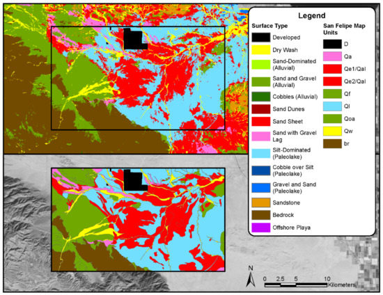Furthermore, geomorphological processes are another factor controlling the distribution of playa surface types and their erodibility [19,22]. Playa margins are a complex assemblage of geomorphic landforms (e.g., beach ridges, aeolian dunes, coastal spits and bars, deltas, splay systems) that can be used to interpret past depositional events (runoff, re-deposition, dune formation/encroachment) [83,84].