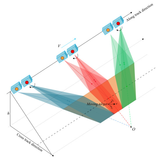 Moreover, SAR systems that combine the azimuth multichannel technology and the sliding spotlight mode can not only obtain high-resolution images, but also have great potential in ground moving target indication (GMTI). They can meet the demand of long-time monitoring, better detection capability and high-resolution imaging of moving targets. It can serve tasks such as recognition and interpretation of moving targets and prediction of motion trajectories. In addition, the multi-aspect observation can help alleviate the problem of moving targets being blocked. The geometry of a dual-channel spaceborne SAR system operated in sliding spotlight mode is shown in Figure 1. Multiple antennas are placed along the track to provide spatial degrees of freedom for suppressing the background clutter. Nevertheless, the research on multichannel sliding spotlight SAR GMTI is lacking at present [8,9,10]. Therefore, this letter firstly studies the channel phase mismatch calibration on the processing of the dual-channel sliding spotlight SAR data with displaced-phase-center antenna (DPCA) [11,12,13].