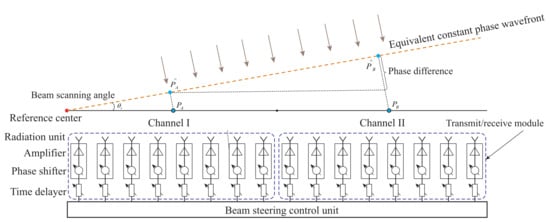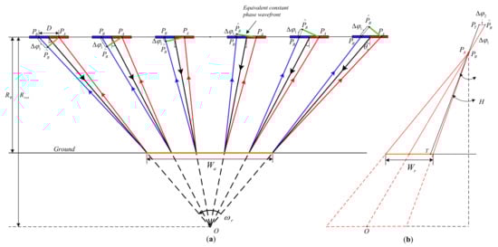 Figure 3 shows the geometry of beam steering in azimuth of a dual-channel sliding spotlight SAR. The direction of the equivalent constant phase wavefront is adjusted by applying different phase offsets to array elements to point to a virtual point O located under the ground. Then, the two channels require continuously changed phase offsets to steer the beam, causing the antenna phase centers to be misaligned from the sensor path, and the geometry is shown in Figure 3a. This phenomenon is regarded as APCF [14,15]. The two receive antenna centers are and , respectively. The phase difference in azimuth applied by the phase shifters between the two channels relative to the reference phase point is obtained as