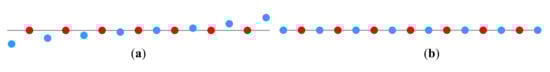 It can be seen from Equation (6) that the antenna spacing can be obtained from the phase of the cross-correlation coefficient between the two channels, but it varies with the scanning angle. Consequently, the two channels cannot be co-registered by an azimuth time shift, which means that the DPCA cannot be applied directly for sliding spotlight SAR-GMTI. After calibrating the phase mismatch between two channels according to Equation (3), the first term associated with in Equation (6) can be eliminated, and the phase of the cross-correlation coefficient becomes a constant related to the actual antenna spacing. Thus, antenna phase centers of a dual-channel sliding spotlight SAR-GMTI system are re-aligned with the sensor path after the phase calibration, which provides the premise for implementing the DPCA method. Figure 4a,b shows the antenna phase center movement in a dual-channel sliding spotlight SAR before and after the phase mismatch calibration.