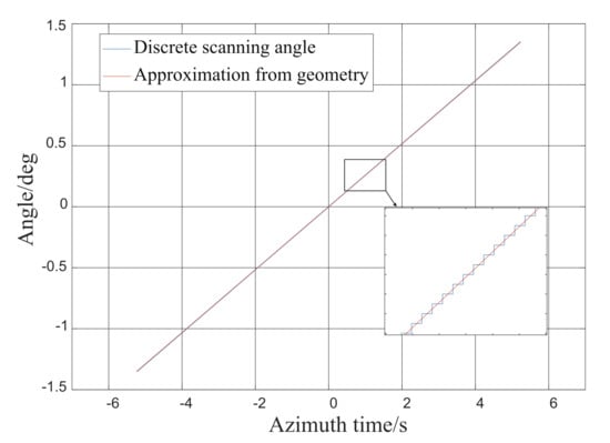 where and represent the antenna’s two-way power pattern. In addition, the actual scanning angle range of Gaofen-3 operated in sliding spotlight mode is −1.35∼1.35 during this experiment. The antenna beam steering is carried out on a burst basis [20]. The stepped scanning angle is , and the number of pulse at one scanning angle is 121. There is only a slight difference between Equations (3) and the approximation in Equation (8), which is illustrated in Figure 5.