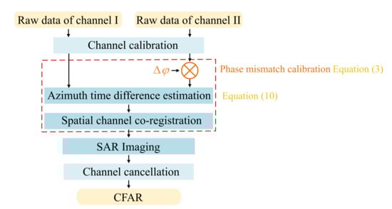 From Equation (13), the azimuth time difference between the two channels of sliding spotlight SAR after the phase mismatch calibration is . Therefore, the two channels can be co-registered spatially by a constant time shift in azimuth, and clutter can be suppressed by the channel cancellation. The complete signal processing flowchart based on the DPCA method with the proposed phase mismatch calibration is shown in Figure 6. First, the inevitable channel imbalance, such as amplitude imbalance, range sampling time error, and phase mismatches from other origins, must be calibrated [18,21] before the implementation of channel cancellation. The second step is to obtain and compensate the channel phase mismatch based on Equation (3). The azimuth time difference between the two channels can be estimated, and the spatial channel co-registration is implemented accordingly later. Finally, the clutter suppression can be obtained by the cancellation of two SAR images, and the moving targets can be detected by the two-dimensional cell-averaging constant false alarm rate (CFAR) detector [22]. The pseudocode of the processing scheme is presented in Algorithm 1.
