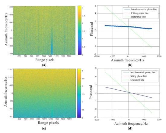 where represents the azimuth time difference of the two receiving antennas. It can be seen from Figure 7a that the varying linear phase along the azimuth frequency is unclear. Figure 7c shows that the interferometric phase of the Des Moines scene after the proposed phase mismatch calibration, and the linear phase can easily be recognized. Then, the antenna spacing D can be obtained by the slope of the interferometric phase line, which can be expressed as
