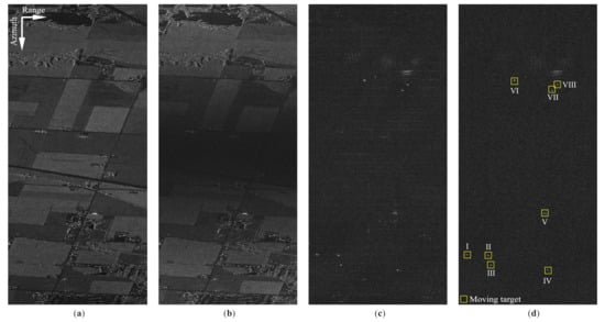 Figure 9a shows the whole area of interest obtained by the Gaofen-3 system operated in sliding spotlight mode in this experiment. The clutter suppression result of the conventional DPCA method is shown in Figure 9b. It can be seen that only a small area of clutter in the middle is suppressed partially, but most of the clutter on both sides is strengthened instead. The power of the clutter on both sides is strengthened by about 2.5095 dB, which indicates the failure of the channel cancellation. A probable explanation for the clutter suppression of the middle area is that the squint angle of the sliding spotlight SAR system corresponding to the data in middle area is very close to zero, and the burst basis of the antenna beam steering [20]. Hence, the middle area data of the two channels have little mismatch relates to the beam sweeping, which is similar to the stripmap SAR data. Then, the clutter in this area can be suppressed by the DPCA method.