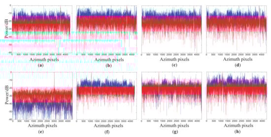 Power comparisons of the detected moving targets before and after clutter suppression. (a–h) show the power variations of the range cells where the detected moving targets (I∼VIII) marked in Figure 9c are located. The blue line and the red line represent the signals before and after clutter suppression, respectively.