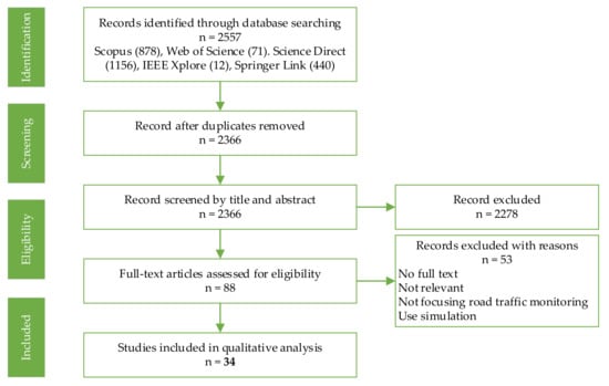 The papers were selected according to the following inclusion criteria: articles addressing UAV with focus on traffic monitoring or traffic analysis; articles published in English; articles published in peer-review journals; articles published from 2010 onwards; research articles.
