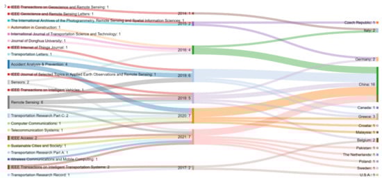 The quantitative analysis of the publications is presented in Figure 3, where the distribution of papers in terms of journal, publication year, and country is presented. This was realized online []. As can be seen, the analyzed articles were published in top ranking journals like Automation in Construction (AC), Transportation Research: Part A (TR_A), IEEE Internet of Things (IoT) Journal and so on. Most of the articles identified have been published in Remote Sensing (six studies), then Accident Analysis & Prevention (AAP) (four studies), IEEE Access (two studies), IEEE Transactions on Intelligent Transportation Systems (two studies), Transportation Research: Part C (two studies).