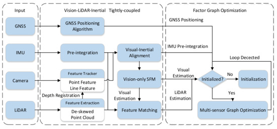 From the perspective of the back-end fusion strategy, LVIO can be classified into two categories based on different optimization algorithms: filter-based methods and factor graph methods. Although the filtering method is a traditional technology to realize multi-sensor fusion, its principle defect of frequent reconstruction of increasing or decreasing sensors limits its application in LVIO [20]. As an emerging method in recent years, the factor graph method can effectively improve the robustness of SLAM system when a single sensor fails because of its plug-and-play characteristics. Therefore, it is widely applied to deal with such heterogeneous aperiodic data fusion problems [21]. In addition, since LVIO is in the local frame, there are inherent defects such as accumulated errors. Thus GNSS measurements need to be introduced for global correction [22,23,24] to realize local accuracy and global drift-free position estimation, which makes full use of their complementarity [24]. The research on adding GNSS global constraints into the local sensor fusion framework are as follows: Lin et al. modified the extended Kalman filter to realize a loose coupling between GPS measurements and LiDAR state estimation, but there is a large single linearization error to be solved [17]. In 2019, Qin et al. proposed VINS-Fusion, which uses nonlinear optimization strategies to support Camera, IMU, and GNSS [25], but it assumes that GNSS is continuous and globally convergent, which is inconsistent with reality. In any case, these strategies presented above provide numerous reliable ideas.