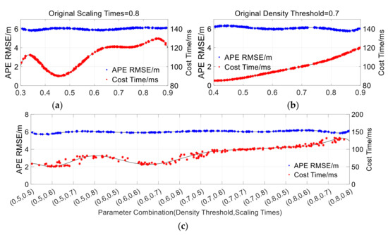 We measured the positioning accuracy by the root mean square error of absolute trajectory error (APE_RMSE). The accuracy and real-time performance of different values of and on the Hong Kong 0428 dataset are shown in Figure 2. The Monte Carlo method was used in this experiment. Within the parameter range that ensures the stable operation of the line feature extraction algorithm, we conducted three experiments. First of all, as shown in Figure 2a, under the premise that the original scaling times , 100 random numbers were selected in the range of to carry out the experiment of density threshold selection. Secondly, as shown in Figure 2b, we kept the original density threshold , and then selected 100 random numbers in the range of , which is to select the appropriate range of scaling times . Finally, as shown in Figure 2c, within the appropriate parameter range obtained in the previous experiments, 100 groups of parameter combinations were randomly selected for line feature extraction to obtain the optimal value.