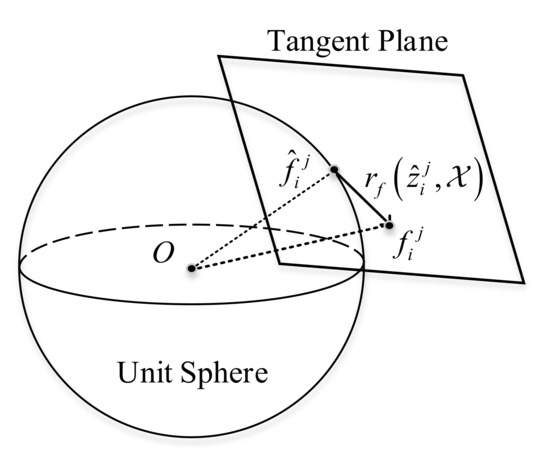 The visual feature factor is essentially the re-projection error of the visual feature, that is, the difference between the theoretical value projected on the image plane and the actual observation value. In order to unify the coordinate system in Section 3.3, we provide the definition of re-projection error on the unit sphere instead of the generalized image plane. Specific schematic diagrams are shown in Figure 6 and Figure 7.