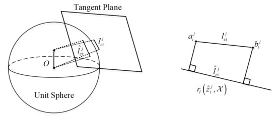 where is the camera internal reference projection matrix. It can be seen from Equation (12) that the spatial coordinates of the line features projected onto the unit sphere are only related to . The two end points of the observation line are and , then the re-projection error of the line feature can be expressed by the dotted distance from the two end points of the observation line feature to the projection line feature: