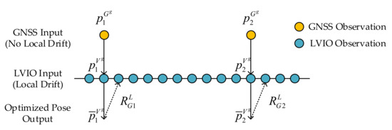When the carrier moves to a GNSS signal trusted environment, GNSS factors can be added to optimize with local sensors. The time interval of two frames of GNSS observations is , and given the GNSS measurements in the global frame and representing the observation of LVIO in the global frame, the GNSS factor can be expressed by the following observation residuals: