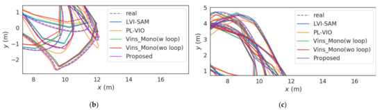 To verify the superior performance of each aspect of our system, we performed ablation experiments, constructed without GNSS global correction (*), without visual line features (#), and our complete system (proposed), respectively. The experimental results are shown in Figure 15 and Figure 16 and Table 2.