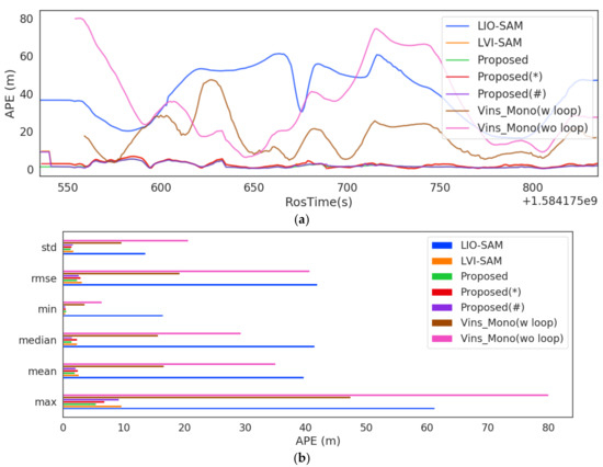 To evaluate the performance of the algorithm we conducted in the outdoor environment, the Hong Kong dataset was used for performance evaluation and it was compared with other similar advanced algorithms. The experimental equipment and environment are shown in Figure 14. The sensor models are as follows: the camera is BFLY-U3-23S6C-C, the LiDAR is HDL 32E Velodyne, IMU is Xsens Mti 10, and the GNSS receiver is u-blox M8T. In addition, we utilized the high-grade RTK GNSS/INS integrated navigation system, NovAtel SPAN-CPT, as the ground truth.