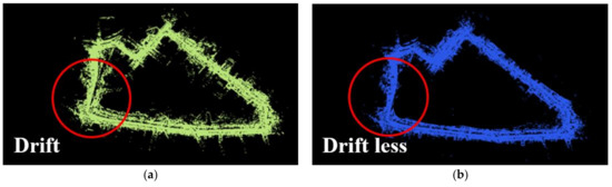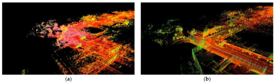 Further, comparison of the LiDAR point cloud detail views is shown in Figure 18. The more accurate VIO pose estimation after the line features are added provides a more accurate initial value for LiDAR scan matching, and reduces a large number of point cloud mismatching. Comparison of global point cloud trajectories is shown in Figure 19. The area marked by circles demonstrates that the data drift caused by cumulative errors is significantly reduced by adding a GNSS factor and loop factor to our algorithm.